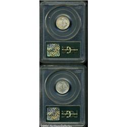 <B>1916<10C> MS65 Full Bands PCGS,</B></I> boldly struck, potent luster, dusky tan and pearl-gray patina; and a <B>1920 MS65 Full Bands PCGS,</B></I> a splendidly preserved Gem with rich peripheral russet colors, an above average strike. Both holders have green label inserts.<BR><I>From The Reed Hawn Collection of Mercury Dimes.</B></I> 2 coins <BR><BR><B>Important notice:</B> Heritage usually auctions material at the rate of 200-250 lots per hour. On some occasions eBay Live bid software or the Internet may not be able to keep up with the pace of the auction. We recommend placing a realistic absentee bid now as insurance to avoid disappointment. Occasionally the auctioneer may eliminate or reject an eBay Live bid, and the auctioneer may also reopen a lot after the close of the eBay live bidding (usually because we missed an audience bid), and may reject your bid even if it shows you as the winning bidder. By bidding via eBay Live, you agree that Heritage may award the lot to another bidder at its sole discretion under the circumstances described above or any other reasonable circumstances. Since eBay bids are not shown to us until we open the lot on the floor, we treat those bids just like floor bids. In most cases the floor responds before the eBay bid is presented to us, due to Internet lag time, so for consistency we have made it a policy that floor bids are always considered first over tie eBay live bids. Also please note that all Heritage lots purchased through eBay Live carry a 20% Buyer's Premium. Please make sure you read the Terms and Conditions before you bid. </span></font></tr></table></td></tr></table>