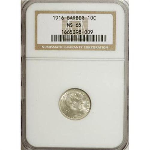 <B>1916 10C MS65 NGC.</B></I> NGC Census: (109/39). PCGS Population (89/40). Mintage: 18,490,000. Numismedia Wsl. Price for NGC/PCGS coin in MS65: $550. (#4870)<BR><BR><B>Coin Engraver:</B> Charles E. Barber<BR><BR><b>Shipping:</b> Coins & Currency (<a target="_blank" href="http://www.heritageauctions.com/common/shipping.php">view shipping information</a>\)