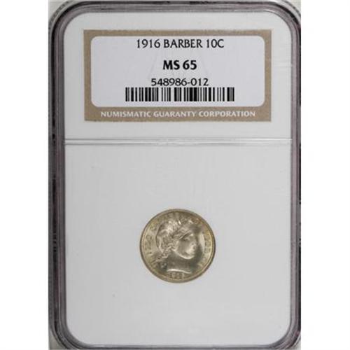 <B>1916 10C MS65 PCGS.</B></I> PCGS Population (91/43). NGC Census: (108/42). Mintage: 18,490,000. Numismedia Wsl. Price for NGC/PCGS coin in MS65: $550. (#4870)<BR><BR><B>Coin Engraver:</B> Charles E. Barber<BR><BR><b>Shipping:</b> Coins & Currency (<a target="_blank" href="http://www.heritageauctions.com/common/shipping.php">view shipping information</a>)