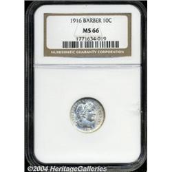 <B>1916<10C> MS66 NGC.</B></I> Razor sharp details occur on most of the design elements of this nearly untoned, brilliant Barber dime that has virtually flawless satiny surfaces. Population: 27 in 66, 5 finer (4/04). <BR><BR><B>Important notice:</B> Heritage usually auctions material at the rate of 200-250 lots per hour. On some occasions eBay Live bid software or the Internet may not be able to keep up with the pace of the auction. We recommend placing a realistic absentee bid now as insurance to avoid disappointment. Occasionally the auctioneer may eliminate or reject an eBay Live bid, and the auctioneer may also reopen a lot after the close of the eBay live bidding (usually because we missed an audience bid), and may reject your bid even if it shows you as the winning bidder. By bidding via eBay Live, you agree that Heritage may award the lot to another bidder at its sole discretion under the circumstances described above or any other reasonable circumstances. Since eBay bids are not shown to us until we open the lot on the floor, we treat those bids just like floor bids. In most cases the floor responds before the eBay bid is presented to us, due to Internet lag time, so for consistency we have made it a policy that floor bids are always considered first over tie eBay live bids. Also please note that all Heritage lots purchased through eBay Live carry a 20% Buyer's Premium. Please make sure you read the Terms and Conditions before you bid.