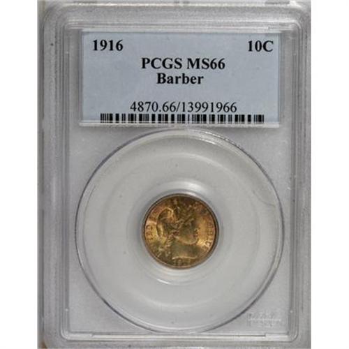 <B>1916 10C MS66 PCGS.</B></I> A strongly lustrous and exquisitely preserved representative of this final Barber dime issue, crisply struck with amazing eye appeal. Rich amber and orange patina graces the obverse, while the reverse is scarcely toned. PCGS has graded just five coins finer (9/07).<BR><BR><B>Coin Engraver:</B> Charles E. Barber<BR><BR><b>Shipping:</b> Coins & Currency (<a target="_blank" href="http://www.heritageauctions.com/common/shipping.php">view shipping information</a>)