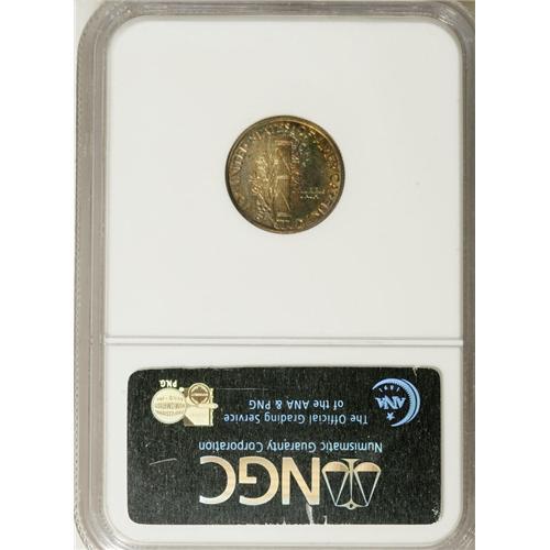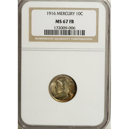 <B>1916 10C MS67 Full Bands NGC.</B></I> A boldly impressed and carefully preserved example of this first-year issue, strongly lustrous beneath gold, cerulean, and rose patina that shapes into concentric circles on the reverse. Highly appealing.<BR><BR><b>Shipping:</b> Coins & Currency (<a target="_blank" href="http://www.heritageauctions.com/common/shipping.php">view shipping information</a>)