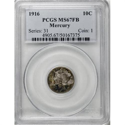 <B>1916 10C MS67 Full Bands PCGS.</B></I> Beautiful dappled purple, rose, sea-green, and russet patina adorns the beautifully preserved surfaces of this lovely Mercury dime. Bold detail and immaculate preservation combine for undeniable eye appeal. PCGS has graded just eight finer Full Bands coins (1/08).<BR><BR><B>Coin Engraver:</B> Adolph A. Weinman<BR><BR><b>Shipping:</b> Coins & Currency (<a target="_blank" href="http://www.heritageauctions.com/common/shipping.php">view shipping information</a>)