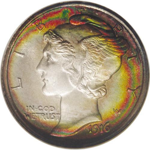<B>1916<10C> MS67 <img border='0' src='http://www.heritagecoins.com/images/star.gif' width=10 height=10> Full Bands NGC.</B></I> A Superb Gem <img border='0' src='http://www.heritagecoins.com/images/star.gif' width=10 height=10> designated example by NGC, this sharply struck example displays concentric circles of deep and engaging peripheral iridescent toning, and attractive frosted surfaces. An especially colorful coin destined for the toning enthusiast.