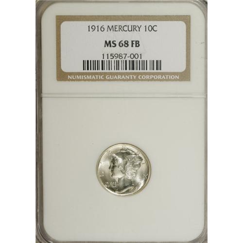 <B>1916 10C MS68 Full Bands NGC.</B></I> This is a truly great example of the first Philadelphia issue of the Mercury dime. Intense mint frost shimmers over both sides, and the impeccably preserved surfaces are snow-white and absolutely untoned. Anyone searching for the highest quality in a 1916 dime should seriously consider the current offering. Census: 14 in 68, 0 finer (3/07).<BR><BR><b>Shipping:</b> Coins & Currency (<a target="_blank" href="http://www.heritageauctions.com/common/shipping.php">view shipping information</a>)