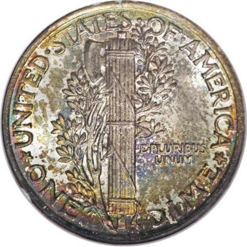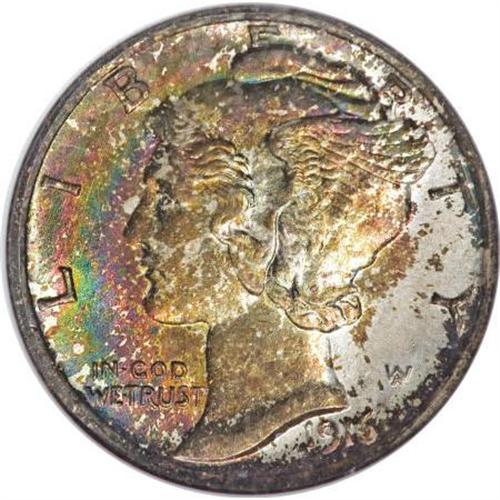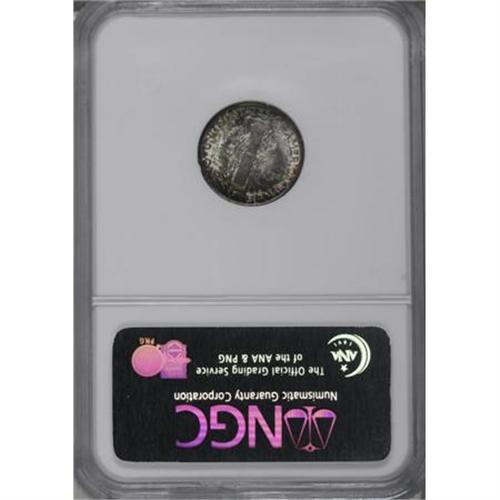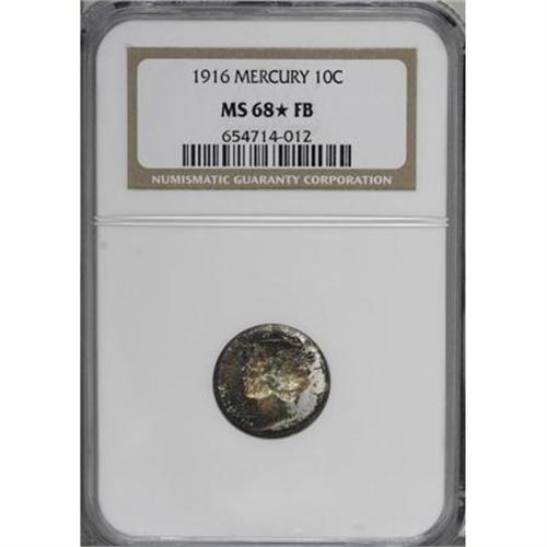 <B>1916 10C MS68 Full Bands NGC.</B></I> <B>1916 10C MS68 <img border='0' src='http://www.heritagecoins.com/images/star.gif' width=10 height=10> Full Bands NGC.</B></I> An exemplary, wholly original first-year issue that is partially layered in each side in mottled russet, rose-violet, and emerald-green toning. Obviously original, significant portions of the original silver surface are evident on each side. Always popular and always available in lower grades, this is one of the finest 1916 dimes known. Population: 2 in 68 <B> S</B></I>, 0 finer (10/07).<BR><BR><B>Coin Engraver:</B> Adolph A. Weinman<BR><BR><b>Shipping:</b> Coins & Currency (<a target="_blank" href="http://www.heritageauctions.com/common/shipping.php">view shipping information</a>)