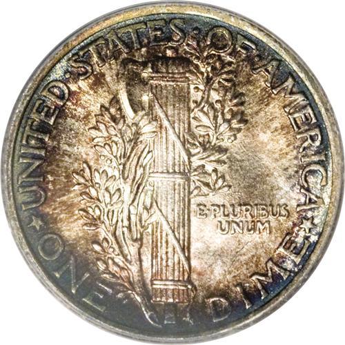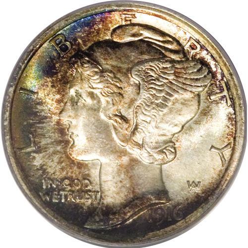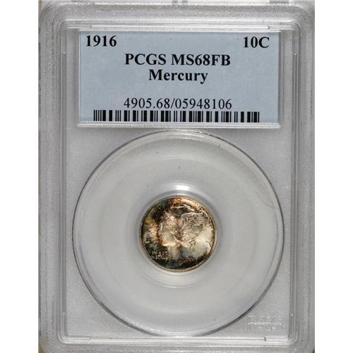 <B>1916 10C MS68 Full Bands PCGS.</B></I> Few coins of any date or denomination ever achieve the lofty MS68 grade assessment. Adapted from Dr. William Sheldon's grading scale for early large cents, a coin may be designated at any level from Poor 1 to Mint State 70.<BR> This first-year issue was widely saved by Eastern collectors, and is fairly easy to obtain at all grade levels through MS65, even with Full Bands. At MS66 Full Bands the population begins to shrink, and at MS68 a mere 22 pieces have been seen, through the combined efforts of NGC and PCGS (2/07). The current offering represents one of the most impressive examples of this issue in existence. Combined with razor-sharp details and intense luster, the near-pristine surfaces display rich, beautiful layers of deep red-brown, magenta, and electric-blue coloration. This marriage of technical and aesthetic merits is a rare occurrence indeed.<BR><BR><b>Shipping:</b> Coins & Currency (<a target="_blank" href="http://www.heritageauctions.com/common/shipping.php">view shipping information</a>)