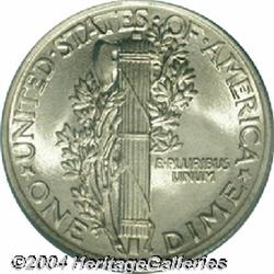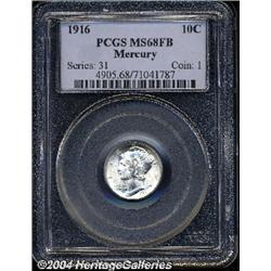 <B>1916<10C> MS68 Full Bands PCGS.</B></I> This sparkling white gem is awash in fresh mint lustre. Every detail is boldly struck, including the central bands crossing the fasces. The superb quality of the surfaces really make this coin shine, for dimes of this period are rare when so close to perfect. Population: 7 in 68, 0 finer (9/04). <BR><BR><B>Important notice:</B> Heritage usually auctions material at the rate of 200-250 lots per hour. On some occasions eBay Live bid software or the Internet may not be able to keep up with the pace of the auction. We recommend placing a realistic absentee bid now as insurance to avoid disappointment. Occasionally the auctioneer may eliminate or reject an eBay Live bid, and the auctioneer may also reopen a lot after the close of the eBay live bidding (usually because we missed an audience bid), and may reject your bid even if it shows you as the winning bidder. By bidding via eBay Live, you agree that Heritage may award the lot to another bidder at its sole discretion under the circumstances described above or any other reasonable circumstances. Since eBay bids are not shown to us until we open the lot on the floor, we treat those bids just like floor bids. In most cases the floor responds before the eBay bid is presented to us, due to Internet lag time, so for consistency we have made it a policy that floor bids are always considered first over tie eBay live bids. Also please note that all Heritage lots purchased through eBay Live carry a 20% Buyer's Premium. Please make sure you read the Terms and Conditions before you bid.