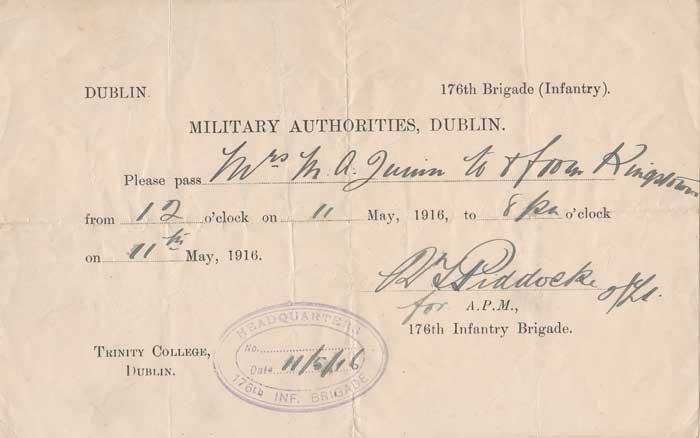 Issued by "Military Authorities, Dublin", 176th Brigade (Infantry) Trinity College Dublin, to Mrs MA Quinn from 12 noon to 8pm on 11 May 1916 to travel between Dublin and Kingstown (Dun Laoghaire). Signed by Lt. RF Piddock for Assistant Provost Marshal, with HQ stamp of 176th Brigade.
