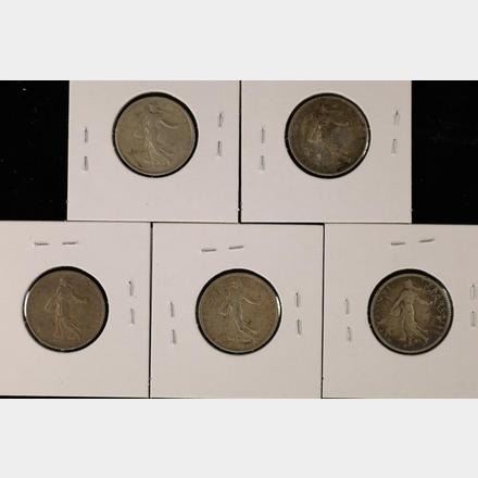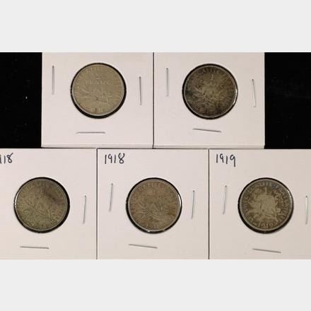 1916, 1917, 2-1918, & 1919 FRANCE SILVER 1 FRANC