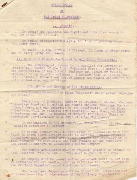 A typed early copy of the 1918 constitution of the Irish Volunteers and the military service certificate of James J. Flynn, Dolphin Street, Loughrea, County Galway confirming his pension claim for service with the Irish Volunteers from prior to the Easter Rebellion until 1922. (2 items)