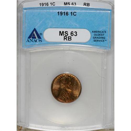 <B>1916 1C MS63 Red and Brown ANACS.</B></I> NGC Census: (22/184). PCGS Population (30/237). Mintage: 131,833,680. Numismedia Wsl. Price for NGC/PCGS coin in MS63: $28. (#2487)<BR><BR><b>Shipping:</b> Coins & Currency (<a target="_blank" href="http://www.heritageauctions.com/common/shipping.php">view shipping information</a>)