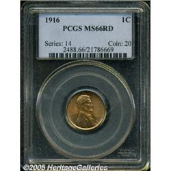 <B>1916 1C MS66 Red PCGS.</B></I> Bright coppery-gold patina shows splashes of mint-green on each side. Nicely struck design elements and immaculately preserved surfaces.
