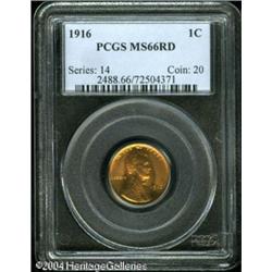 1916 1C MS66 Red PCGS. Orange-gold surfaces are so <B>1916 1C MS66 Red PCGS.</B></I> Orange-gold surfaces are somewhat pebbly, particularly on the obverse. Well struck, with pleasing luster. <BR><BR><B>Important notice:</B> Heritage usually auctions material at the rate of 200-250 lots per hour. On some occasions eBay Live bid software or the Internet may not be able to keep up with the pace of the auction. We recommend placing a realistic absentee bid now as insurance to avoid disappointment. Occasionally the auctioneer may eliminate or reject an eBay Live bid, and the auctioneer may also reopen a lot after the close of the eBay live bidding (usually because we missed an audience bid), and may reject your bid even if it shows you as the winning bidder. By bidding via eBay Live, you agree that Heritage may award the lot to another bidder at its sole discretion under the circumstances described above or any other reasonable circumstances. Since eBay bids are not shown to us until we open the lot on the floor, we treat those bids just like floor bids. In most cases the floor responds before the eBay bid is presented to us, due to Internet lag time, so for consistency we have made it a policy that floor bids are always considered first over tie eBay live bids. Also please note that all Heritage lots purchased through eBay Live carry a 20% Buyer's Premium. Please make sure you read the Terms and Conditions before you bid. This lot is being auctioned in conjunction with a live floor auction by Heritage Galleries & Auctioneers. All final auction and invoice information will be supplied by Heritage Galleries & Auctioneers, and all other information should be considered preliminary. Lot:5264
