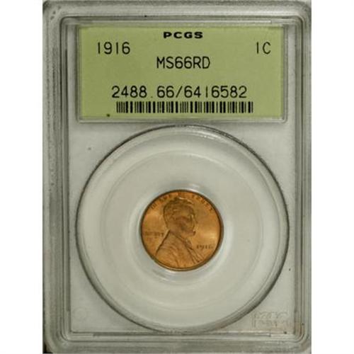 <B>1916 1C MS66 Red PCGS.</B></I> This orange-gold Premium Gem has dazzling luster and minimal carbon. The color is seamless, and there are no abrasions. In an old green label holder.<BR><BR><B>Coin Engraver:</B> Victor D. Brenner<BR><BR><b>Shipping:</b> Coins & Currency (<a target="_blank" href="http://www.heritageauctions.com/common/shipping.php">view shipping information</a>)
