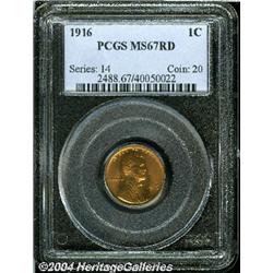 <B>1916<1C> MS67 Red PCGS.</B></I> With a mintage of more than 131 million pieces, it is hard to imagine calling any 1916 Cent "rare." However, in this grade, it is seldom encountered and is truly deserving of the "rare" label. Only 27 other pieces have been so graded with none finer at either service (9/04). It is, in fact, impossible to imagine a finer coin than this one. The surfaces are bright and lustrous with original orange-red coloration throughout. The devices show pinpoint detailing and the surfaces overall display the granular, matte-like finish usually seen on copper coins from this decade. Population: 26 in 67, 0 finer (9/04). <BR><BR><B>Important notice:</B> Heritage usually auctions material at the rate of 200-250 lots per hour. On some occasions eBay Live bid software or the Internet may not be able to keep up with the pace of the auction. We recommend placing a realistic absentee bid now as insurance to avoid disappointment. Occasionally the auctioneer may eliminate or reject an eBay Live bid, and the auctioneer may also reopen a lot after the close of the eBay live bidding (usually because we missed an audience bid), and may reject your bid even if it shows you as the winning bidder. By bidding via eBay Live, you agree that Heritage may award the lot to another bidder at its sole discretion under the circumstances described above or any other reasonable circumstances. Since eBay bids are not shown to us until we open the lot on the floor, we treat those bids just like floor bids. In most cases the floor responds before the eBay bid is presented to us, due to Internet lag time, so for consistency we have made it a policy that floor bids are always considered first over tie eBay live bids. Also please note that all Heritage lots purchased through eBay Live carry a 20% Buyer's Premium. Please make sure you read the Terms and Conditions before you bid.