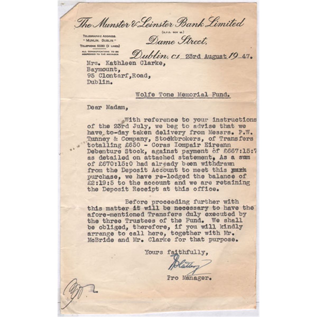 Includes hallmarked silver "1916" stick pin badge produced in 1966. Receipts addressed to Kathleen Clarke (widow of Tom Clarke) relating to the Wolfe Tone memorial fund and letter dated 27 March 1967 relating to her speech at the opening of a Fenian Exhibition in Kilmainham Jail. Also with other hand written notes relating to the history of the 1916 Rebellion and Wood Quay campaign poster.