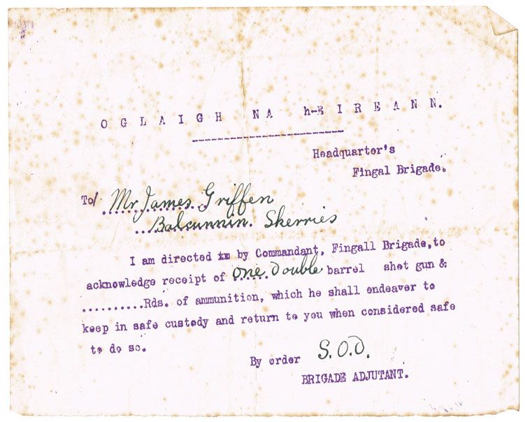 Mimeograph, manuscript.Receipt issued by 'Headquarter's Fingal Brigade' to Mr. James Griffen of Balcunnin Skerries for one double barrel shotgun. Initialled by the Brigade Adjutant