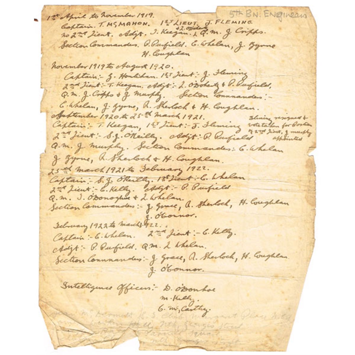 A number of pages of handwritten lists, probably by a veteran, of members Fianna Éireann. "C" Company 2nd Battalion Fianna Éireann 1920-21, with addresses. G Company, 1st Battalion, Dublin Brigade Old IRA list of members killed in action 1916, '20 & '22. List of Officers & Soldiers in the 5th Battalion Engineers, Dublin 1919 to 1922. An interesting and useful collection (3 items)