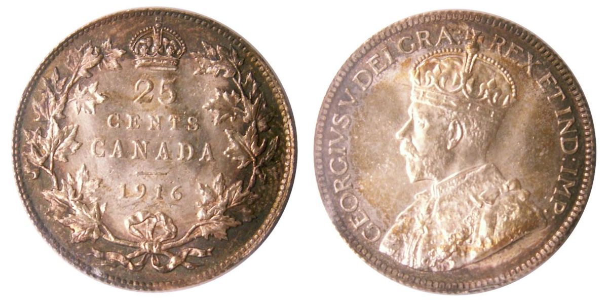 1916 25¢ ICCS MS64. PQ example and great eye appeal. Excellent strike with clean fields and nice surfaces.