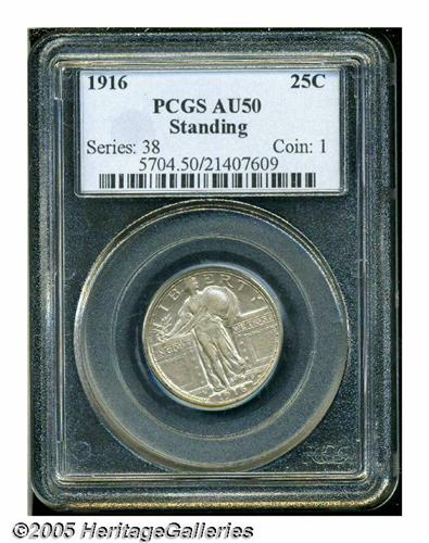 <B>1916<25C> AU50 PCGS.</B></I> Struck late in 1916, only 52,000 pieces were produced of this first-year issue. Most slipped quietly into circulation and the Type One 1917 quarters followed quickly on the heels of the 1916's appearance in the channels of commerce. When the Type Two quarters appeared later in the year, the public began to hoard the Type One 1917 coins, and once again little attention was given to the 1916. This is a premium example for the grade with light, even rub over the highpoints. The surfaces are evenly toned in pale lavender with occasional lilac undertones noted. A few handling marks are seen on the obverse with a remarkably clean reverse.