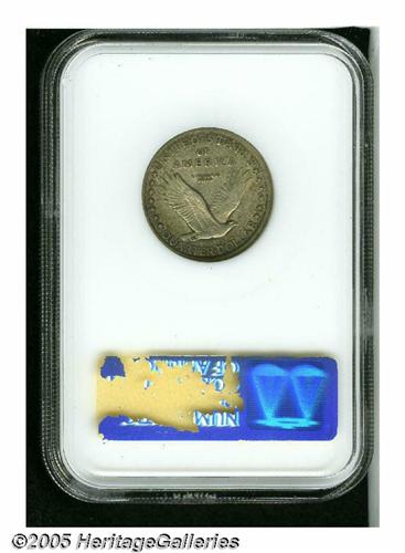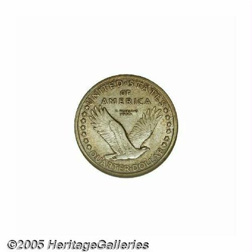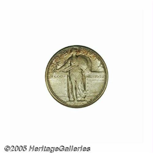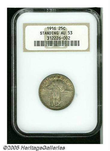<B>1916<25C> AU53 NGC.</B></I> After President Teddy Roosevelt began his campaign for new coinage designs several years earlier, the silver denominations finally had their day. New gold designs were created in 1907 and 1908 with the Lincoln cent making its debut in 1909 and the Buffalo nickel in 1913. New designs for the Mercury dime, the Standing Liberty quarter, and the Walking Liberty half dollar finally appeared in 1916, bringing the Barber design to a close. All of these designs were well-received by the public. The 1916 quarter presented here is the key to the Standing Liberty series. This lightly circulated piece has silvery-gray surfaces with touches of golden-brown toning at the peripheries, which on the reverse begins to gravitate to the center. The designs are slightly soft on the inner and outer shields, and a small mark on Liberty's chest is not bothersome.<BR><I>From The Stig Ericsson Collection.</B></I>