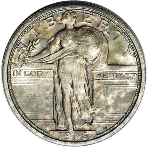 <B>1916<25C> AU58 NGC.</B></I> The Philadelphia Mint produced the first Standing Liberty Quarters between December 16 and 31 of this year. The total number of 1916-dated coins struck was just 52,000 pieces, and these were released to the public early the next year. The limited original mintage of the 1916 propelled it to instant stardom among numismatists, a position that it has retained ever since. This lightly circulated example retains considerable luster, and is sharply defined on the motifs. Both sides are covered in mottled electric-blue, lavender, and gold-brown patination. The surfaces are quite well preserved, revealing just a couple of small milling marks in the fields above the juncture of the eagle's wings.