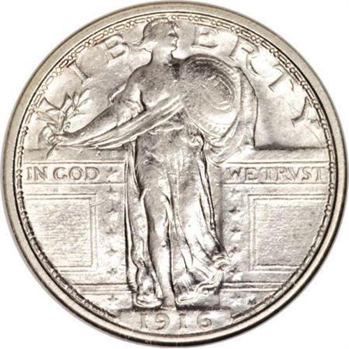 <B>1916 25C AU58 NGC.</B></I> The first year of issue 1916 Standing Liberty quarter is perhaps the most sought-after piece in the entire series, along with the 1918/7-S. Its 52,000-piece mintage is second only to the '18/7-S, that according to J.H. Cline in his <I>Standing Liberty Quarters</B></I> reference, has an estimated production of about 2,500 coins.<BR> The About Uncirculated 58 example offered here displays bright silver-white surfaces that possess ample luster. Most of the design elements exhibit fairly good detail for an issue that is almost always weakly struck, though the shield is soft, especially the inner one. A few light circulation marks are visible, the most notable being a linear abrasion on the left gate and Liberty's wrist<BR><BR><b>Shipping:</b> Coins & Currency (<a target="_blank" href="http://www.heritageauctions.com/common/shipping.php">view shipping information</a>)