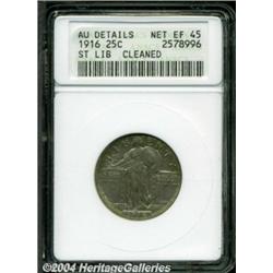 <table><tr><td><table><tr><td>1916 25C--Cleaned--ANACS. AU Details, Net XF45. A slightly bright and glossy olive-gold example with a few wispy vertical hairlines on each side that can only be observed under a glass. The shimmering luster is extensive if mildly subdued, and the devices possess only light highpoint rub. The 1916 Standing Liberty Quarter is a numismatic classic, and its production of 52,000 pieces is the second lowest of any 20th century circulating silver issue. Only the 1913-S Quarter has a smaller mintage. <BR><BR><B>Important notice:</B> Heritage usually auctions material at the rate of 200-250 lots per hour. On some occasions eBay Live bid software or the Internet may not be able to keep up with the pace of the auction. We recommend placing a realistic absentee bid now as insurance to avoid disappointment. Occasionally the auctioneer may eliminate or reject an eBay Live bid, and the auctioneer may also reopen a lot after the close of the eBay live bidding (usually because we missed an audience bid), and may reject your bid even if it shows you as the winning bidder. By bidding via eBay Live, you agree that Heritage may award the lot to another bidder at its sole discretion under the circumstances described above or any other reasonable circumstances. Since eBay bids are not shown to us until we open the lot on the floor, we treat those bids just like floor bids. In most cases the floor responds before the eBay bid is presented to us, due to Internet lag time, so for consistency we have made it a policy that floor bids are always considered first over tie eBay live bids. Also please note that all Heritage lots purchased through eBay Live carry a 20% Buyer's Premium. Please make sure you read the Terms and Conditions before you bid. <BR><BR><B>IMPORTANT ANNOUNCEMENT ABOUT RESERVES:</B> Heritage now divulges all reserves on its web site 7 days before every auction. If you want to know whether the reserve on this lot has been met, and if not, what the reserve amount is, please visit this lot page on the HeritageCoin.com web site, or email: bid@HeritageGalleries.com </span></font></td></tr></table></td></tr></table>