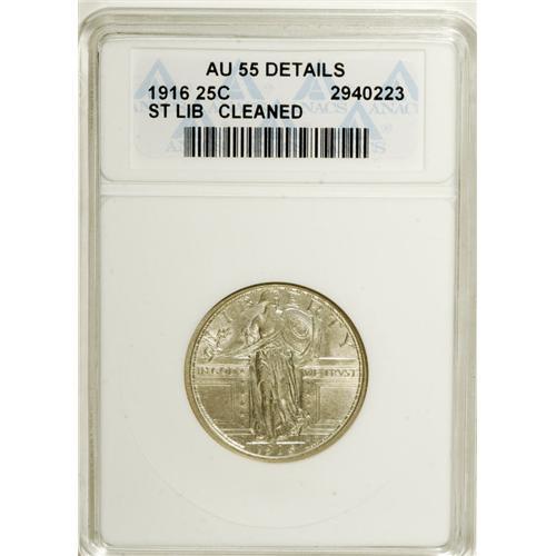 <B>1916 25C --Cleaned--ANACS. AU55 Details.</B></I> A lustrous key date quarter with only a hint of rub on Liberty's exposed leg. Brilliant except for a hint of gold patina. Probably dipped at one time, but most numismatists would consider the piece to be a highlight of their collection.<BR><I>From The Edward Sacks Collection.</B></I><BR><BR><b>Shipping:</b> Coins & Currency (<a target="_blank" href="http://www.heritageauctions.com/common/shipping.php">view shipping information</a>)