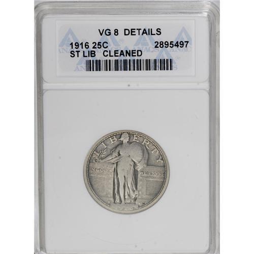 <B>1916<25C>--Cleaned--ANACS. VG8 Details.</B></I> This was the first year of the Standing Liberty quarter, as well as the first year of the Mercury dime and the Walking Liberty half dollar. The presently offered coin is a pleasing example for the grade, and exhibits minimal damage from an old cleaning. Neither side reveals any distracting abrasions, and the remaining design details are extensive. An affordable key date specimen.