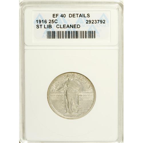 <B>1916 25C --Cleaned--ANACS. XF40 Details.</B></I> Pastel sky-blue and gold tints emerge from this briefly circulated key date quarter. Luster shimmers across protected areas, and Liberty's leg and shield show only moderate wear. Dull from a mild cleaning, but certainly a desirable representative of this famous and low mintage introductory issue.<BR><BR><b>Shipping:</b> Coin/Currency (<a target="_blank" href="http://www.heritageauctions.com/common/shipping.php">view shipping information</a>)
