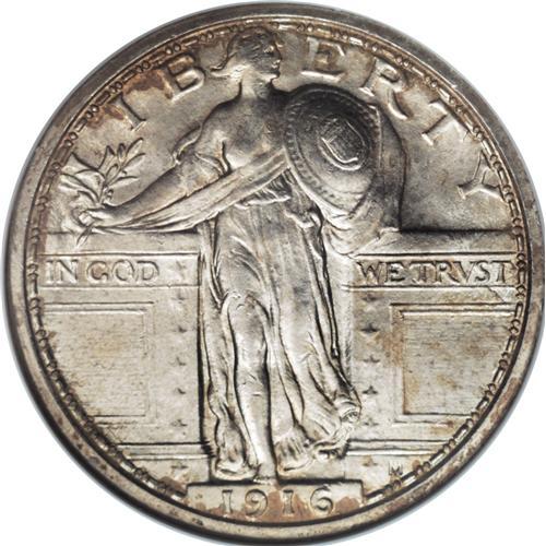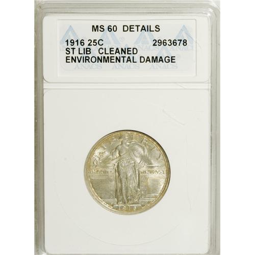<B>1916 25C --Cleaned, Environmental Damage--ANACS. MS60 Details.</B></I> The 1916 has the second lowest mintage in the series, second only to the overdate. As with key coins in all series, examples are sought out in all grades. This is an attractive example that far surpasses the disclaimers on the ANACS insert. There are just the lightest hairlines present on each side. Lustrous throughout and brilliant except for a light accent of golden around the margins.<BR><BR><b>Shipping:</b> Coins & Currency (<a target="_blank" href="http://www.heritageauctions.com/common/shipping.php">view shipping information</a>)
