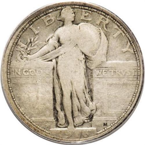 <B>1916 25C Fine 12 PCGS.</B></I> We present hear a rather pleasing, problem-free example of this key-date quarter. Light gray patination bathes both sides, with hints of sky-blue at the obverse margins. Despite the combination of soft strike that characterizes this issue and moderate wear, this Fine specimen still shows nice detail. There are no marks worthy of individual mention. This piece will fit well into a medium-grade Standing Liberty quarter set.<BR><BR><b>Shipping:</b> Coins & Currency (<a target="_blank" href="http://www.heritageauctions.com/common/shipping.php">view shipping information</a>)
