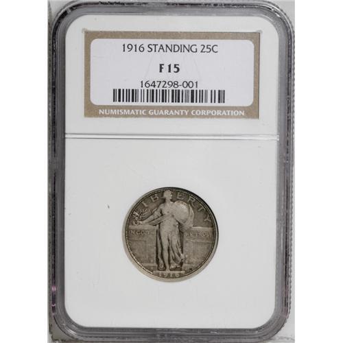 <B>1916<25C> Fine 15 NGC.</B></I> The fields are smoke-gray with lighter silver-gray highpoints, with a bit of darker buildup around the devices on each side. Despite the 45 points of wear, this key coin remains quite attractive, with no mentionable surface impairments and a pleasing wealth of detail remaining.