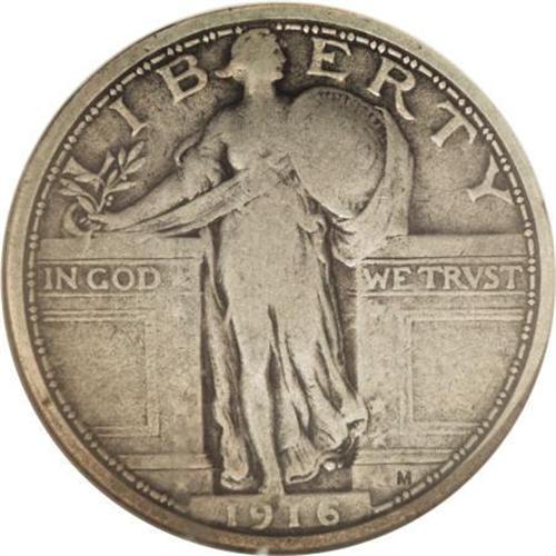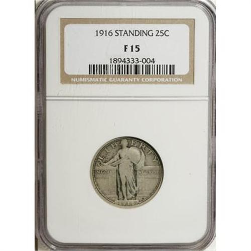 <B>1916 25C Fine 15 NGC.</B></I> Although it shows considerable signs of circulation, the date is complete and bold, arguably the most important consideration when choosing a lower or middle grade circulated example of this low mintage key-date issue. Both sides have natural light silver-gray surfaces with darker charcoal toning along the borders and around the devices.<I><BR>From The Beau Clerc Collection.</B></I><BR><BR><b>Shipping:</b> Coins & Currency (<a target="_blank" href="http://www.heritageauctions.com/common/shipping.php">view shipping information</a>)