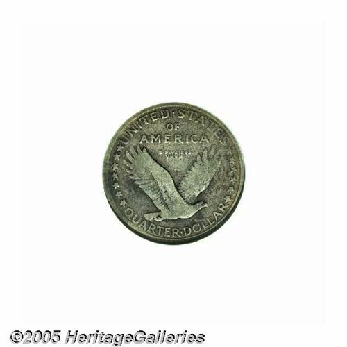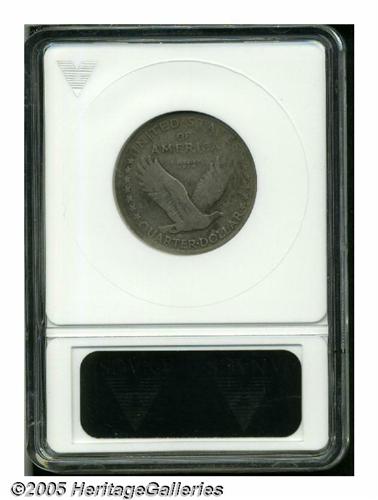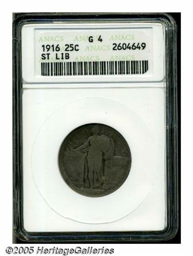 <B>1916<25C> Good 4 ANACS.</B></I> Heavily worn with deep gray patina over most of each side and lighter gray accents over the highpoints. As with all pre-1925 Standing Liberty quarters, the date wore away rather quickly as it was raised above the exergual area. On this coin, the 6 in the date is discernible but just barely. A problem-free coin for the grade.