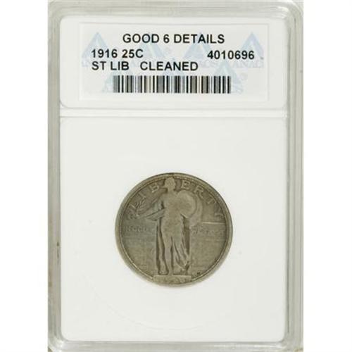 <B>1916 25C --Cleaned--ANACS. Good 6 Details.</B></I> The bottom half of the date is clear, and the lower loop of the 6 is obvious. All remaining legends are bold. The pearl-gray fields and devices cede to gunmetal toning near the rims. A bit bright from a wipe, but a collectible example of this numismatic classic.<BR><BR><b>Shipping:</b> Coins & Currency (<a target="_blank" href="http://www.heritageauctions.com/common/shipping.php">view shipping information</a>)