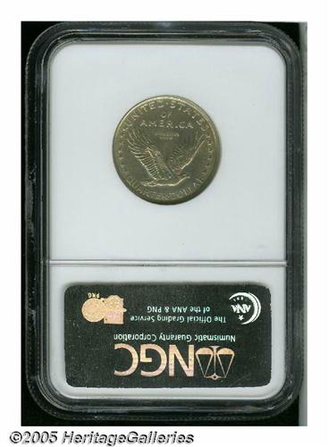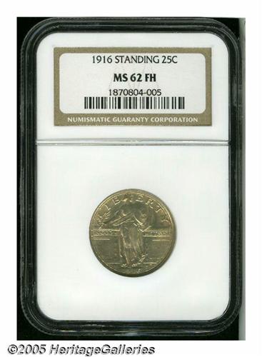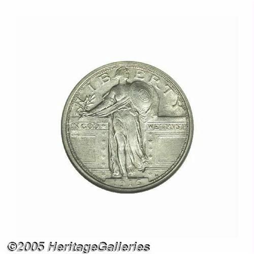 <B>1916<25C> MS62 Full Head NGC.</B></I> Struck in the last few days of 1916, the 52,000 Quarters that were produced of the new Standing Liberty design entered circulation with little notice by the public at large. Most likely it was precisely because of the minuscule mintage that few people paid attention. The 1917 issues were more widely recognized and hoarded as they were seen by a wider group of collectors and non-collectors who set them aside as mementoes. The 1916 has always enjoyed a high degree of respect and desirability by all collectors of 20th century coinage. Not all pieces were fully struck, the design being slightly different from the 1917 issues, which are generally well brought up. This is a particularly well struck example that has lovely, satin-like mint luster with just a bit of light golden toning over each side that turns slightly darker around the margins of each side.
