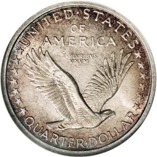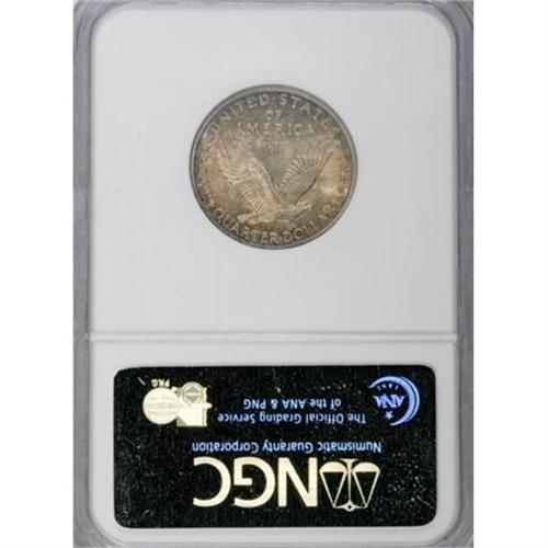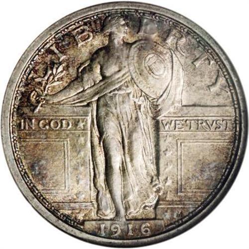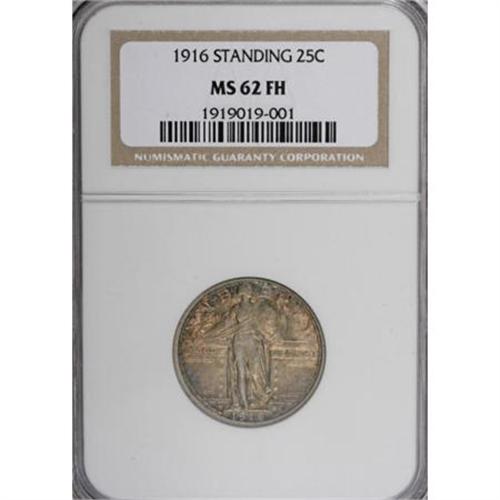 <B>1916 25C MS62 Full Head NGC.</B></I> The story of the Standing Liberty design has been often told. Herman MacNeil's design concept was not accepted by the public, who felt the obverse was too provocative. After Liberty's exposed breast was covered, the design was no longer found offensive.<BR> A gorgeous example of Herman MacNeil's famous Standing Liberty design, representing the first year of issue, and an important key-date from a mintage of just 52,000 coins. This piece is highly lustrous and sharply detailed with outstanding gold and iridescent toning on both sides.<BR><BR><b>Shipping:</b> Coins & Currency (<a target="_blank" href="http://www.heritageauctions.com/common/shipping.php">view shipping information</a>)