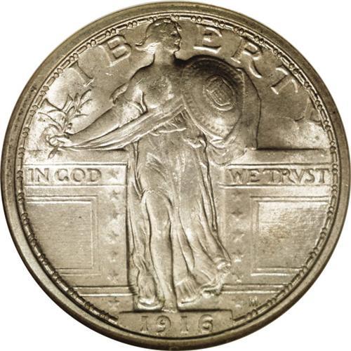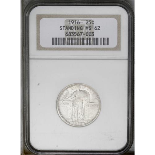 <B>1916<25C> MS62 NGC.</B></I> An Uncirculated example of this important regular issue in the Standing Liberty quarter series, whose only close competition in terms of overall rarity is the 1927-S. While lumped in with the early strikings from 1917 as a two-year type coin, the 1916 actually has several minor design differences from the 1917, which technically make it a one-year type. This piece lacks complete striking details, but the granular surfaces display bright, above average mint luster that is overlaid with gray-rose toning.