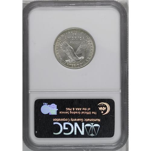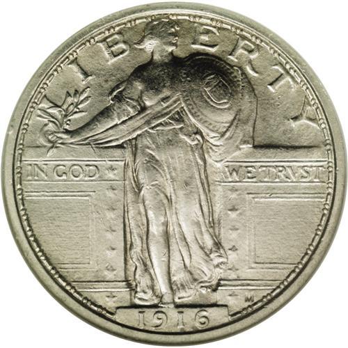 <B>1916<25C> MS62 NGC.</B></I> An attractive, lustrous example of this scarce, key date issue in the Standing Liberty quarter series. Both sides are essentially untoned with only the slightest amount of pale golden-rose color visible at certain angles. Liberty has much of her head detail showing, and few marks of any size are visible. A single small bump is noted at 9 o'clock on the reverse rim. This classic definitely has more eye appeal than the stated grade. Excellent mint luster, the surfaces still show their matte-like satiny brilliance.