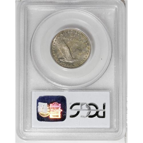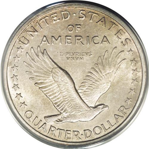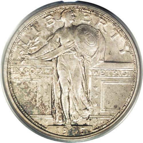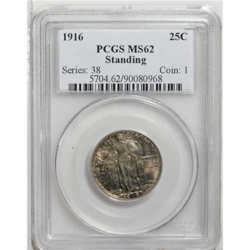 <B>1916<25C> MS62 PCGS.</B></I> Each side offers a light silver-gold cast, with the obverse adding a light patina in hues of russet and ice-blue near the lower border. Bold luster emanates from beneath the light color. This example shows a bit of strike weakness on the shield highpoints as well as the head, and on the eagle's breast. However, the overall eye appeal is considerable. This is nonetheless a lovely Mint State example of this, a key date in a popular series as well as a key 20th century first-year type coin. In many series, specifically those that have been overlooked in the hot market of recent years, MS62 and MS63 coins appear to offer good value at a reasonable price. Perhaps this is such a coin.