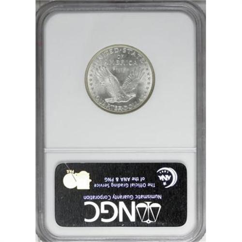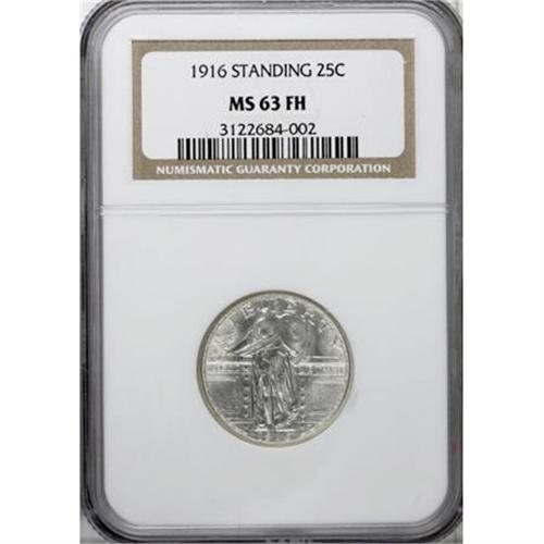 <B>1916 25C MS63 Full Head NGC.</B></I> The famous 1916 Standing Liberty quarter, with a mintage of just 52,000 coins, is one of the important 20th century American numismatic classics. Collectors demand examples of this date in all grades from Good to Gem. Of course, sharply struck Mint State examples are most popular with those whose budget allows such an acquisition.<BR> This lovely piece is highly lustrous with brilliant silver surfaces that are entirely untoned. The surfaces are exceptional with few marks visible, even under a glass. Design details on both sides are impressive, especially considering the typical poor strike. This sharp impression is clearly above average.<BR><BR><b>Shipping:</b> Coins & Currency (<a target="_blank" href="http://www.heritageauctions.com/common/shipping.php">view shipping information</a>)