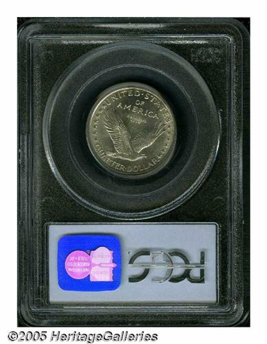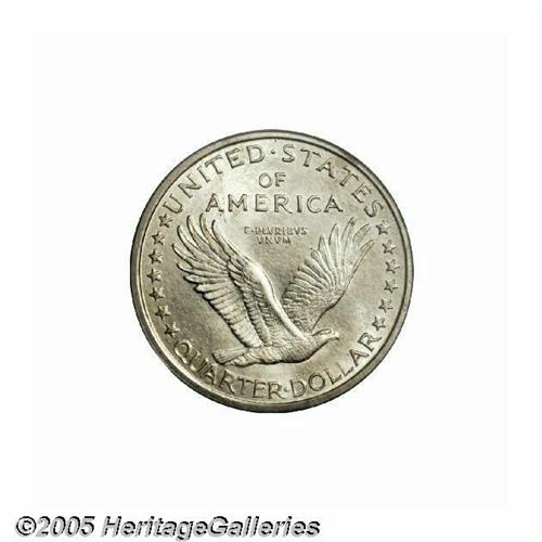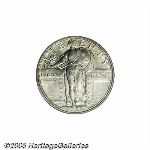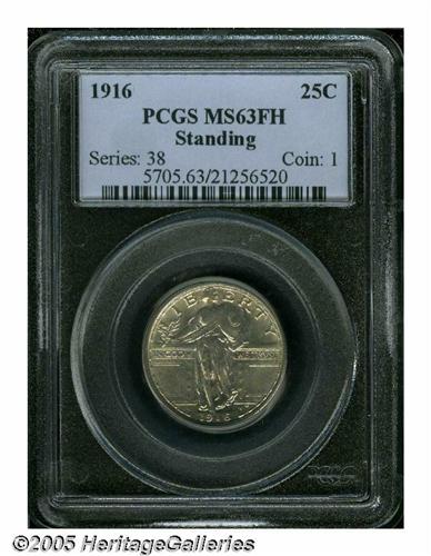 <B>1916<25C> MS63 Full Head PCGS.</B></I> Satiny and attractive. Pale golden iridescence complements both the obverse and reverse. The grade assigned by PCGS appears to be very conservative, and it's likely that many numismatists would have assigned a grade a point or two higher. A scant 52,000 examples of the variety were issued, by far the smallest production figure for any date in the Standing Liberty series, and indeed one of the smallest quarter dollar mintages for the 20th century, save for the 1913-S (which has a slightly smaller mintage of 40,000 pieces). Adding to the desirability of the issue is the fact that it is really a one-year design type, since the designs were modified slightly prior to the issuance of the 1917 Type One quarters. These changes are described in some detail in <I>Walter Breen's Complete Encyclopedia,</B></I> where he writes: "Before Barber completed the working hubs for 1917, he modified the original master die. On 1916 quarters, leaves are broad and close together; on 1917's they are narrow and farther apart."