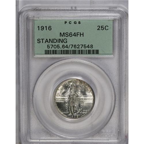 <B>1916<25C> MS64 Full Head PCGS.</B></I> The 1916 quarter, struck in a transitional year between the Barber and Standing Liberty designs, is one of the most famous 20th century silver rarities. The popularity and scarcity of this quarter dollar issue places it in the ranks of such important 20th century American coins as the 1909-S VDB cent, the 1907 High Relief double eagle, and the 1955 Doubled Die cent. This is a shimmering, essentially brilliant example that shows just a trace of peripheral color on each side. Boldly struck for this often poorly defined issue and displaying few appreciable surface marks. The reverse fields have a beautiful matte-like texture. A handful of tiny blemishes are scattered over the reverse, while the obverse is nearly mark-free. In a green label PCGS holder.<BR><I>From The Tide Collection.</B></I>