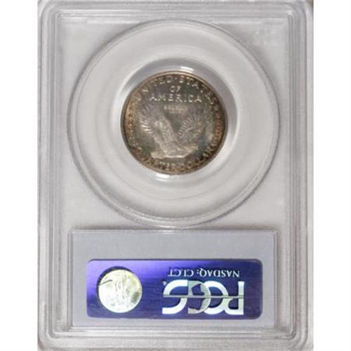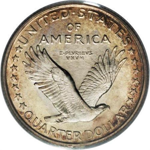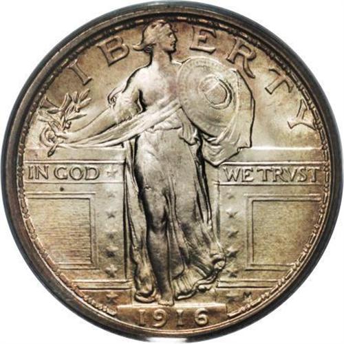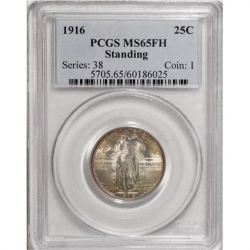 <B>1916 25C MS65 Full Head PCGS.</B></I> We are pleased to present a most amazing Gem Full Head 1916 Standing Liberty quarter. This issue is without doubt the most sought-after coin in the entire series, resulting from it being the first year of issue and its low mintage of 52,000 pieces. Moreover, it is unusual to find a 1916 example with a full head, as only 3% or less come with such detail, according to J.H. Cline (<I>Standing Liberty Quarters, </B></I>fourth edition, 2007).<BR> In addition to Liberty's head, the dies for the most part were kind to this particular coin, as the remaining design detail is better than typically seen on most 1916 specimens. For example, Liberty's toes are all well delineated, as are the gown lines, all four date digits, the rivets, and the eagle's plumage. Radiant luster exudes from silver surfaces visited by whispers of peripheral reddish-brown patina, slightly deeper in hue on the reverse. A few light obverse ticks likely preclude an even higher grade. Indeed, this magnificent coin possesses fewer marks than one would expect for the MS65 grade designation. Population: 69 in 65 Full Head, 13 finer (11/07).<BR><I>From The New York Eye Appeal Collection, Part Three.</B></I><BR><BR><b>Shipping:</b> Coins & Currency (<a target="_blank" href="http://www.heritageauctions.com/common/shipping.php">view shipping information</a>)
