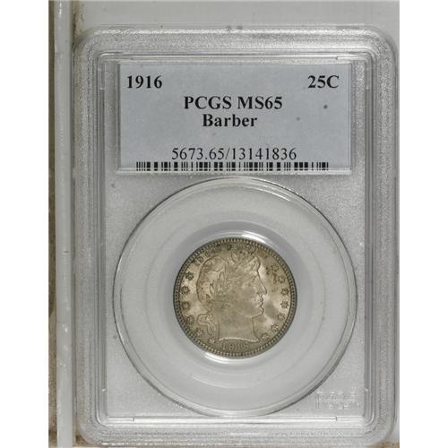 <B>1916 25C MS65 PCGS.</B></I> A lustrous light charcoal-gray example of this last-year Barber quarter, this piece shows a few dark toning spots under a loupe. The sharp strike shows softness only at the upper right shield corner.<BR><BR><b>Shipping:</b> Coins & Currency (<a target="_blank" href="http://www.heritageauctions.com/common/shipping.php">view shipping information</a>)