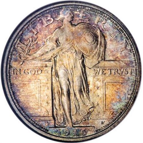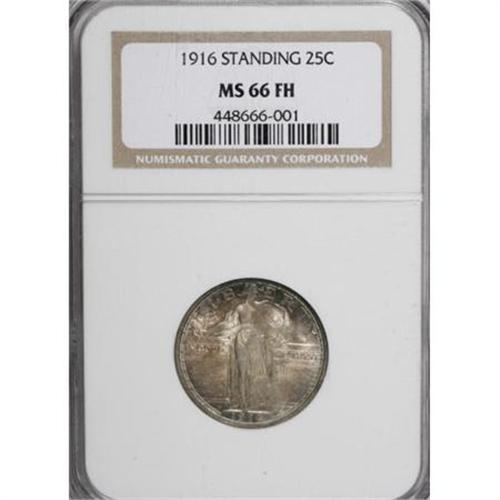 <B>1916 25C MS66 Full Head NGC.</B></I> Standing Liberty quarter pundit J.H. Cline, in his fourth edition of <I>Standing Liberty Quarters </B></I>(2007), opines that less than 3% of the minuscule mintage of 52,000 pieces comes with a Full Head. As of (1/08), both NGC and PCGS combined have certified about 470 Full Head pieces of the 1916 Standing Liberty in all Mint State grades--as always, less an unknown number of resubmissions and crossovers.<BR> In MS66 Full Head--the grade of the present piece--the totals are drastically lower still, of course. NGC has certified 17 coins so fine, with three pieces finer, all MS67 Full Head. PCGS has graded nine coins in MS66 Full Head, with three pieces finer (again, all MS67 Full Head). <BR> The present piece is moderately and deliciously toned on the obverse, with a stunning, frosted silver reverse. The reverse is so pristine and original in appearance that it much more resembles in texture a Washington quarter from the 1940s or 1950s, rather than a Standing Liberty quarter from the teens. The obverse is draped in stunning coloration that includes hues of ice-blue near the rims and champagne-pink in the centers. Both sides emit sharp cartwheel luster, the reverse more obviously so because of the lack of toning.<BR> Cline makes the important point that a 1916 quarter, even one designated Full Head, simply cannot be compared to 1917 Type One quarters; they can only be compared to other 1916 quarters: "The detail was never put on the die to the same degree. 1916s are characteristically softly struck in the shield as well--just overall softness altogether." <BR> This piece does show much, much better detail on Liberty's head than most 1916s, with a sharp nose, eye, and hairline all the way down the crown of the forehead to the rear lock. The shield is softly struck as always, and there are no singular abrasions. This is a simply stunning example of this important early 20th century issue.<BR><I>From The Southwest Collection.</B></I><BR><BR><b>Shipping:</b> Coins & Currency (<a target="_blank" href="http://www.heritageauctions.com/common/shipping.php">view shipping information</a>)