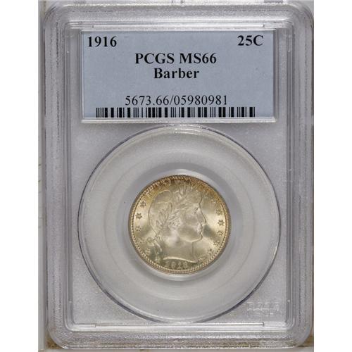 <B>1916 25C MS66 PCGS.</B></I> A well struck representative from the final year of issue that sports fresh, original luster. The fields are largely gold-gray and pale green-gray with zones of sunset-orange near the rims. Population: 21 in 66, 3 finer (12/06).<BR><BR><b>Shipping:</b> Coins & Currency (<a target="_blank" href="http://www.heritageauctions.com/common/shipping.php">view shipping information</a>)